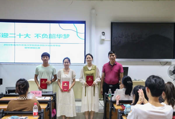 5月22日晚,公司学前教育专业“喜迎二十大,不负韶华梦”钢琴弹唱比赛在五指山校区南苑逸夫楼103教室成功举办。公司党委副书记刘家宝、副经理王启芬以及学前教育专业部分师生到场参加。